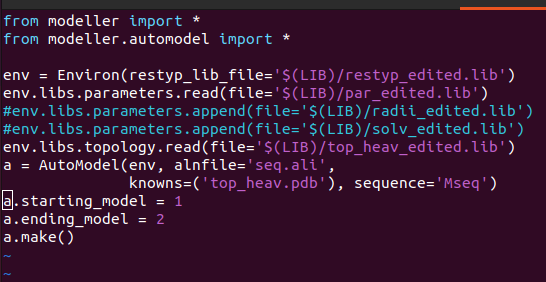 I've been trying to add a new residue's (ligand) topology and parameters into modeller library to model accurately. I am following the steps in modeller's FAQ #8: https://salilab.org/modeller/FAQ.html#8. After adding the topology into a copy of "top_heav.lib", and parameters into a copy of "par.lib", and also into copies of "radii.lib" and "solv.lib", I still get errors. This is the initial script I used: ------------------ [image: image.png] -------------------- The above script gives error in the 5th command-line as follows: ------------------------------ *ERROR Case-1:* >>> env.libs.parameters.append(file='$(LIB)/radii_edited.lib') read_pa_233E> No keyword before contents. Traceback (most recent call last): File "<stdin>", line 1, in <module> File "/usr/lib/python3.10/dist-packages/modeller/parameters.py", line 25, in append return _modeller.mod_parameters_read(self._modpt, self.__libs.modpt, _modeller.ModellerError: read_pa_233E> No keyword before contents. >>> ------------------------------- Therefore, I deleted command-lines 5&6, and executed the following script. ----------------------------- [image: image.png] ---------------------------------- And executing the above script gave the following error for the 5th command-line: -------------------------------------- *ERROR Case-2:* >>> env.libs.topology.read(file='$(LIB)/top_heav_edited.lib') read_to_681_> topology.submodel read from topology file: 3 read_to_231E> CHARMM atom type is not recognized (not in RADII_LIB): CG2D1O Traceback (most recent call last): File "<stdin>", line 1, in <module> File "/usr/lib/python3.10/dist-packages/modeller/topology.py", line 23, in read return self.append(file) File "/usr/lib/python3.10/dist-packages/modeller/topology.py", line 28, in append return _modeller.mod_topology_read(self._modpt, self.__libs.modpt, _modeller.ModellerError: read_to_231E> CHARMM atom type is not recognized (not in RADII_LIB): CG2D1O -------------------------------- This happens inspite of the fact that I have added the radii of new atomtypes into "radii.lib" file itself, and not in the copy "radii_edited.lib", as follows: [image: image.png]